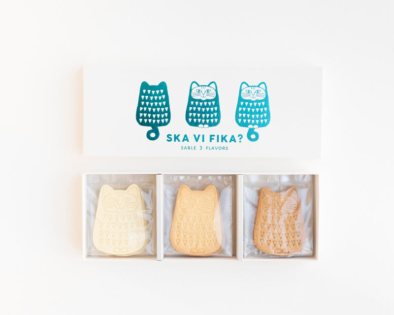 フェアリーケーキフェアのオリジナルは、「ソルト」「バター」「ペッパー」それぞれの味わいで創り上げる3種のねこサブレをセットした、特別な焼き菓子ボックスです。