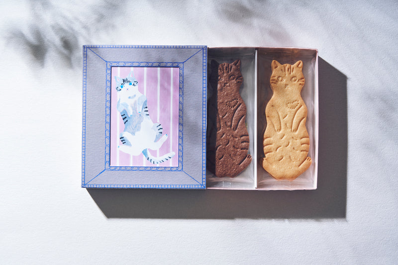 一目みたら、子どもも大人も思わず笑顔になるたのしいネコクッキーとなっています。特別な形状とサイズなので、工房の職人が毎日できたてを1枚1枚優しく丁寧に仕上げてお包みします。