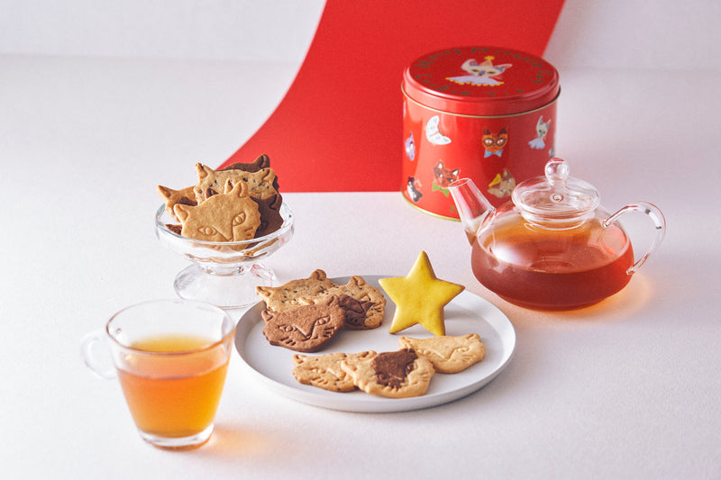 “神様のいたずら”と呼ばれる珍しい柄や不思議な柄のネコが主役のお菓子とクリスマスらしい星形クッキーが入ったクリスマス特別限定缶「Merry Miracle Cat Cookie Tin(“神様のいたずら”クリスマスネコクッキー缶)」が、心踊るホリデーシーズンに登場です。甘酸っぱいレモンアイシングの星形クッキーをトップスターにして並べると、ネコクッキーのツリーもできるたのしいクリスマスクッキー缶。一つとして同じ組み合わせがない様々な模様の手づくりネコクッキーが集まっています。