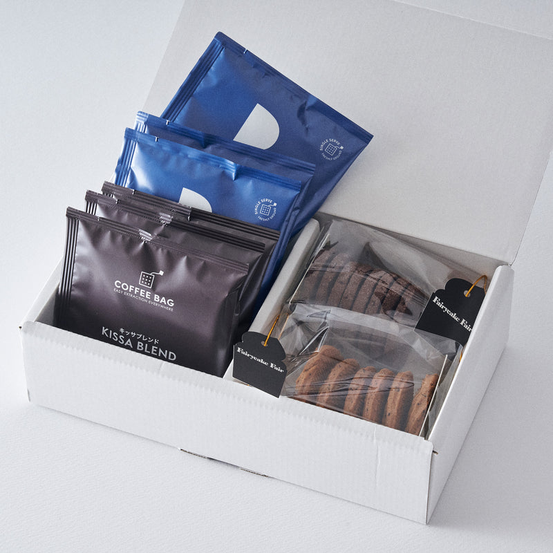 これからの暑い季節に人気の水出しコーヒーバッグを組み合わせたギフトセット。ホンジュラスとブラジルのコーヒー豆をブレンドした深煎りのコーヒー豆を使用。お店と同等クオリティのコールドブリューとフェアリーケーキフェアのこだわり溢れる焼きたてクッキーで、気分転換にぴったりな清々しいひとときが味わえます。