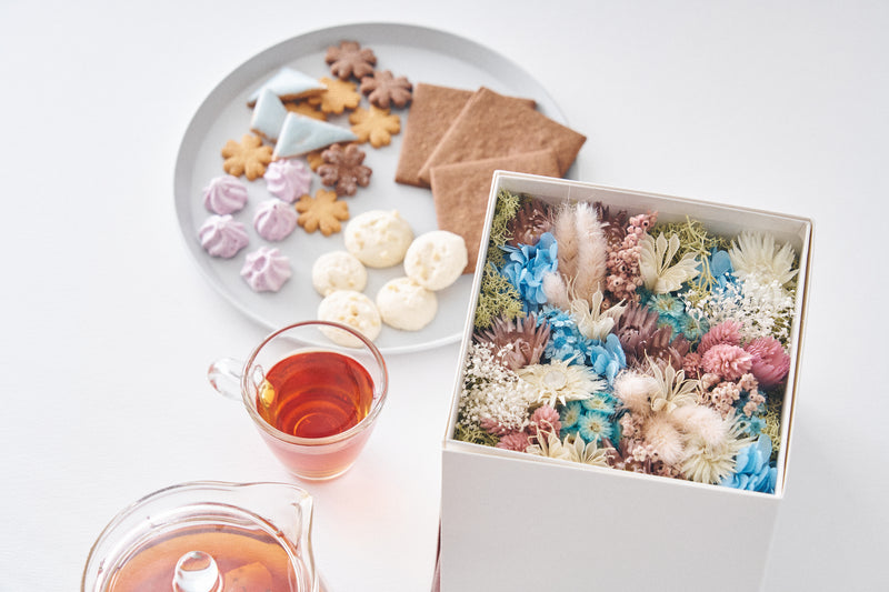 重箱タイプのパッケージ上段は、色とりどりのドライフラワーやプリザーブドフラワーを使用してひとつひとつ丁寧に手づくりされたボックスアレンジメントを、下段にはお花のイメージに合わせた様々な焼き菓子をセット。