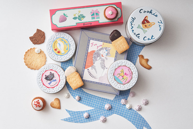 一匹ずつ模様が違う猫たちが可愛い缶にぎっしり。猫好きにはたまらないこちらのクッキー缶は、ミュージシャンの坂本美雨さんとイラストレーターの前田ひさえさんとのコラボレーションで作ったひと缶。珍しい柄や不思議な模様をもつ「神様のいたずら」と呼ばれる猫たちをモチーフに、発酵バターやカカオ、チョコチップを使って焼き上げたクッキーが入っています。「Miracle cat cookie Tin」は収益の一部を動物保護団体へ寄付いたします。