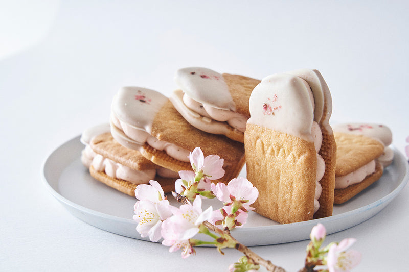 ホワイトチョコレートでハーフコーティングした香ばしいビスケットで一つ一つ丁寧にサンド。仕上げにさくらパウダーをふりかけ、まさにさくら満開の味わいに。