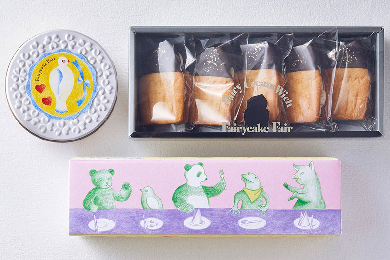 フェアリーケーキフェア人気商品「クリームウィッチ レーズン生バターサンド」「ベイクドZOO」に、ビスケットと自慢のメレンゲ菓子が入った小さなお菓子缶「プチカドーはとハート」の3点セット。