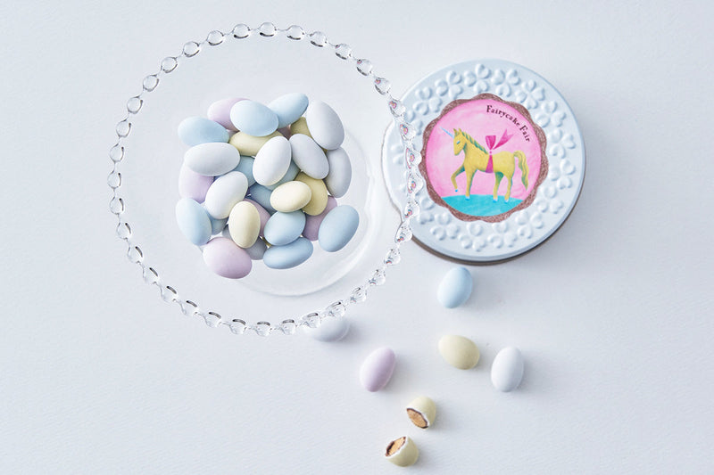 チョコレートをまとわせた香ばしいアーモンドを、淡くやさしい4色の砂糖で包み、小さな缶にそっと詰めました。