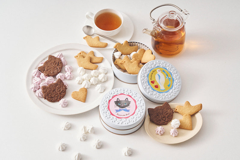 カカオと発酵バターの濃厚な風味が広がる “ねこビスケット” に、口溶けと果実感にこだわった “いちごと木苺のメレンゲ” の新しい味を組み合わせ。カカオとベリーのオーソドックスなコンビネーションのなかにもあたらしいおいしさをとじこめた小さなビスケット缶です。