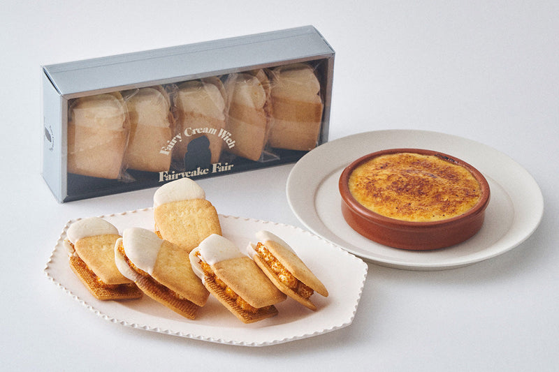 フランス料理の定番スイーツ“クレームブリュレ”を、フェアリーケーキフェアらしい手づくりの生バターサンドで表現した春の新作が登場。甘く華やかにバニラが香る特製アングレーズソースを合わせた生バタークリームに、ジャリっとした焦がしキャラメルの食感を重ねました。クレームブリュレならではの、クリーミーでなめらかな口どけと、香ばしくほろ苦いカラメルの余韻を楽しめます。