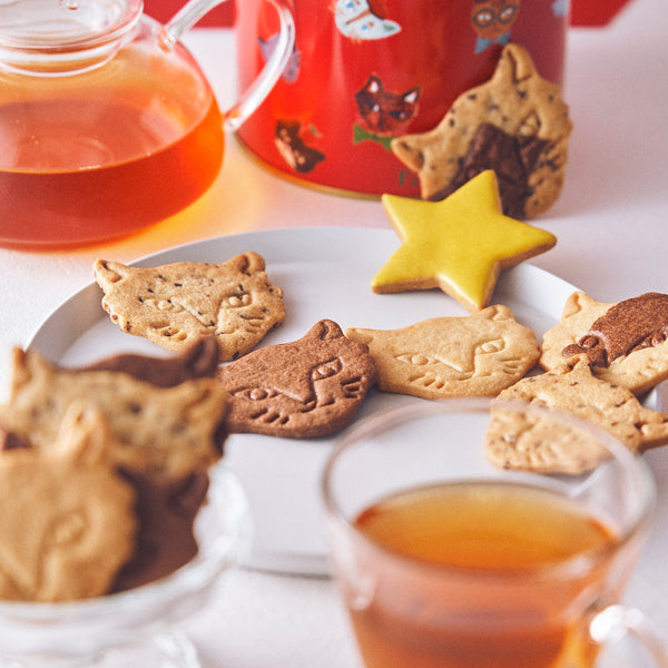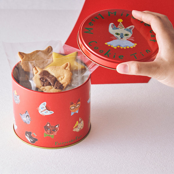 大量生産では実現が難しい一つ一つ違う柄で焼き上げる個性的なネコクッキーは、フェアリーケーキフェアの技巧と特徴を生かした手づくりならではの味わい。クリスマス特別限定缶にはレモンアイシングの星型クッキーが入ります。
