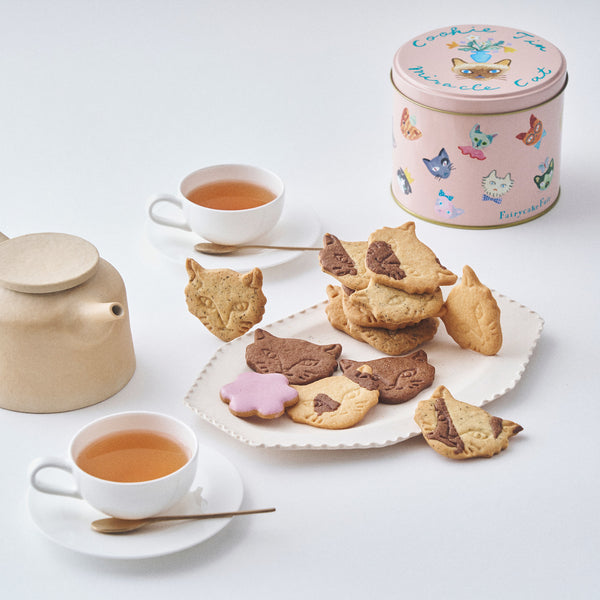 珍しい柄や不思議な模様をもつ「神様のいたずら」と呼ばれる猫たちをモチーフに、発酵バターやカカオ、アールグレイを使って焼き上げたクッキーをアソートし、甘酸っぱいラズベリーのアイシングで彩ったお花型クッキーを組み合わせました。フェアリーケーキフェアがお届けする手づくりクッキーならではのユニークな表情が特徴で、一匹一匹の個性が楽しめる、猫好きにはたまらないクッキー缶です。可愛らしさと華やかさを感じる春らしいひと缶となっています。
